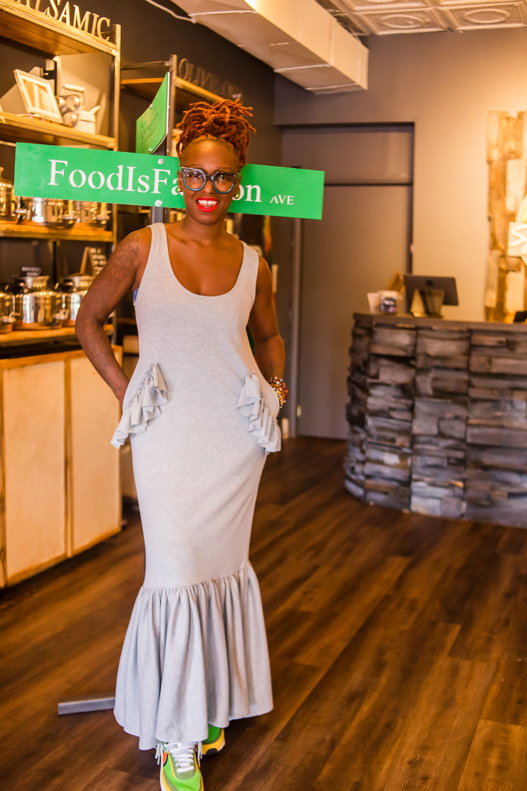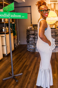 MEDIUM WEIGHT KNIT DRESS WITH POCKETS AND ADDED RUFFLE DETAIL. THIS DRESS COMES IN STANDARD LENGTH, MEASURING 60” FROM SHOULDER TO FLOOR. CAN BE HEMMED TO YOUR DESIRED LENGTH. SEE SIZE CHART TO CHOOSE THE BEST SIZE FOR YOU.